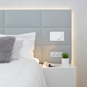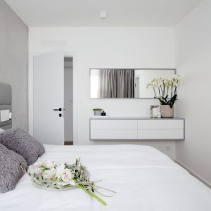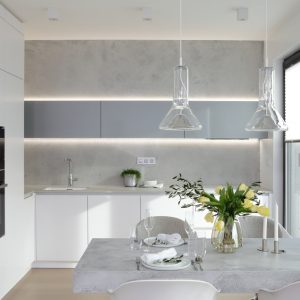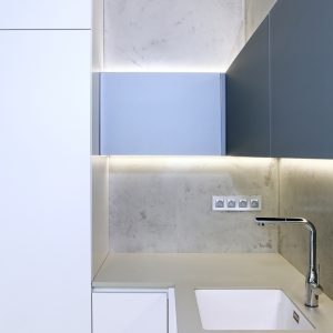 Zvolené materiály odpovídají úrovni návrhu a celého bytu. Nábytek na míru byl vyrobený z laku, pracovní deska v kuchyni je Neolith, na určitých stěnách jsou stěrky v imitaci betonu. I postel v ložnici jsme také vyráběli na míru. Do čela jsou instalované led pásky, vč. zásuvek, vypínačů, nástěnných světel pro případné čtení a noční stolky. Materiál postele a čela je kůže.Vybavení bytu bylo řešeno na míru potřebám klientům a našim návrhům. Naše snaha bylo vytvořit čistý, ale funkční interiér, který úložně využívá prostory celého bytu a bude dobře sloužit svým majitelům… ( Martina Design)
