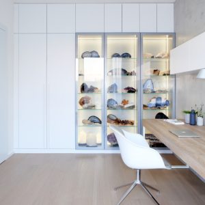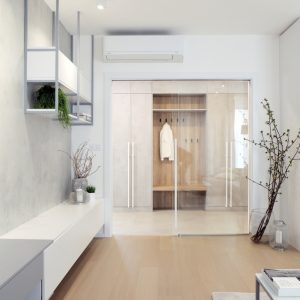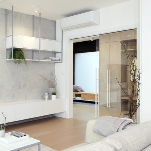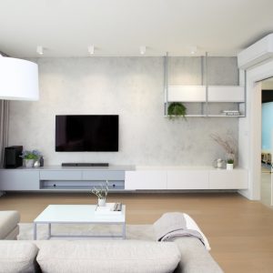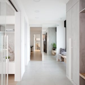 Do sprchy a k vaně jsme si stavebně mohli připravit niky na kosmetiku se zabudovaným ledpáskem pro osvětelní a dále také podomítkové baterie s ručními sprškami. Sprchovou zástěnu jsme řešili s externím dodavatelem na míru po převzetí bytu.Pokládku 3 vrstvé dřevěné podlahy jsme určili v jednotném směru a podařilo se nám docílit plynulé návaznosti do všech místností bez přechodových lišt či tmelových spojů.Ve fázi návrhu interiéru jsme klientům navrhli zvětšení dveřního otvoru u zádveří do obývacího pokoje. Díky jejich nadšení a vůli jsme s developerem a jeho dodavatelem dveří dokázali tuto stavební úpravu realizovat a zvětšit si tak opticky i světelně vstupní zádveří do bytu.Interiér bytu byl navržený citlivě ve stylu čisté moderní elegance spojením bílé a šedé barvy. Pouze v pánské pracovně, v zádveří a v šatně, je na nábytku doplněná kombinace s dřevěným dekorem, který je v bytě jinak použitý pouze na podlaze.