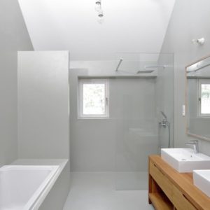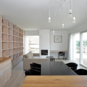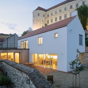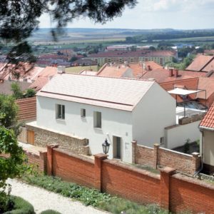 Atmosféru ulice Zámecká v centru Mikulova vytváří drobné měřítko okolních staveb, pohledy do střech historických domů a výhledy do nedalekého Rakouska, masa mikulovského zámku „za zády“ a v neposlední řadě historie židovské čtvrti, v jejímž srdci se nacházela. Aspirací navrženého domu je využít potenciál unikátní lokality, zajistit dostatek soukromí v turisticky rušném okolí, v těsné vazbě na nejužší historické centrum Mikulova působit samozřejmě a nenápadně, přitom dostatečně jasně odlišit dům od okolní historické zástavby.Navržený dům účelně využívá celý pozemek velkosti přibližně 240 m2. Otevírá se do dvora intimní velikosti uzavřeného do zídek z místního vápence a cihel. S prostorem dvora je přímo propojen obývací pokoj a „ateliér“, díky vnějšímu schodišti a velkorysé terase pak ložnice. Pro vnitřní prostor domu je určující využití různých výškových úrovní ulice a dvora, propojování vnitřních prostor, otevření do krovu v patře.Atmosféra solidního zděného domu a k němu připojeného lehkého dřevěného „ateliéru“ je vytvářena rozdílným materiálovým a konstrukčním řešením – dům je zděnou stavbou opatřenou omítkou, ateliér z převážné části dřevostavbou s fasádou z modřínových prken.Dům je vystavěn z „klasických“ materiálů, od materiálově i formálně obdobných okolních historických staveb jej odlišuje provedení detailů. Formu objektu zjednodušují skryté žlaby, keramické střešní tašky jsou obdobné jako v okolí běžně použité bobrovky, jen s rovnou hranou. Okna jsou bezrámová nebo dřevěná s jednoduchými profily, umístěná v různých hloubkách okenních otvorů.Prostor dvora je z velké části zpevněný cihelnou terasou a mlatem, okolo zídek jsou vysázeny růže a bylinky.( Mimosa)