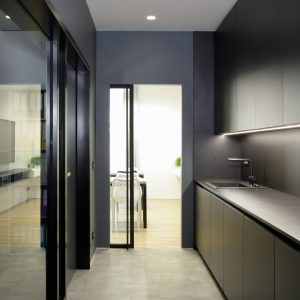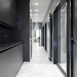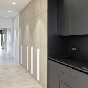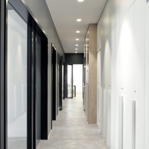 Velkou výzvou pro nás byly tradičně dispozice. Původní projekt počítal s trošku jiným uspořádáním kanceláří, které pro danou firmu nebyly zcela vyhovující. Navýšili jsme toaletu, vytvořili „navíc“ denní místnost pro zaměstnance a vzniklo jasné zónování prostoru, které jsme koncepčně pojali tak, že přední část je pro klienty a zadní pro zaměstnance.Přední část tak pracuje s recepcí, toaletami, kanceláří vedení, zasedací místností a je celá světlá. Zadní část je naopak tmavá. Opticky jsme se zabývali dlouhou chodbou, kterou nemělo smysl řešit dispozičně jinak. Chtěli jsme však rozbít její délku, k čemuž nám pomohlo dělení podlah, výmalba a barva dveří. Do chodby chtěli dostat více přirozeného světla a zároveň i více propojit jednotlivé kanceláře – vznikly tak prosklené příčky, vedle kterých jsme naopak umisťovali plné dveře.Naším cílem bylo vytvořit příjemný a atraktivní pracovní prostor, který bude dostatečně reprezentovat firmu, které má sloužit.(Martina Design)